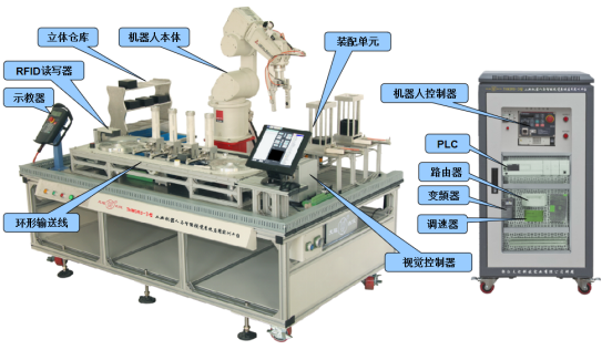 本设备包含六自由度工业机器人、智能视觉检测系统、RFID数据传输系统、PLC控制系统及一套供料、输送、装配、仓储机构,可通过此平台可以进行机械组装、电气线路设计与接线、PLC编程与调试、智能视觉流程编辑、工业机器人编程与调试、RFID数据传输应用等多方面训练。